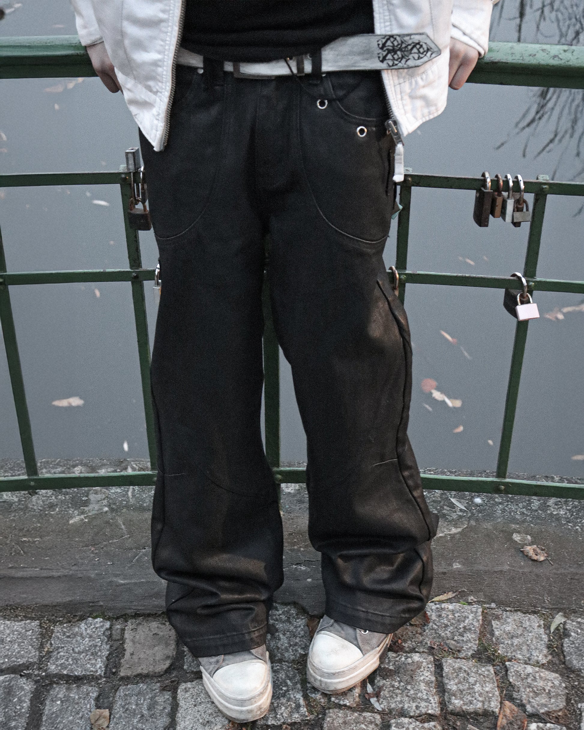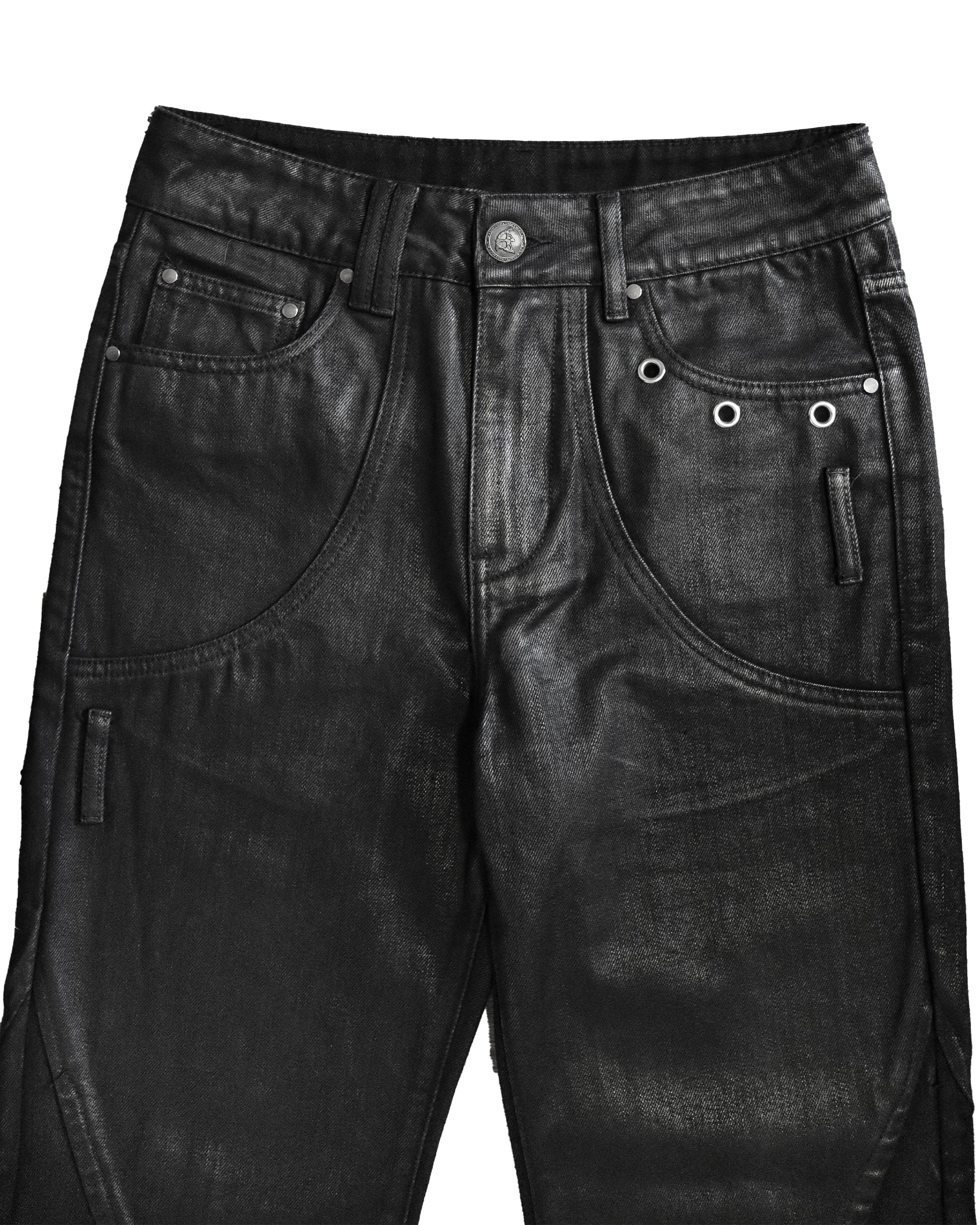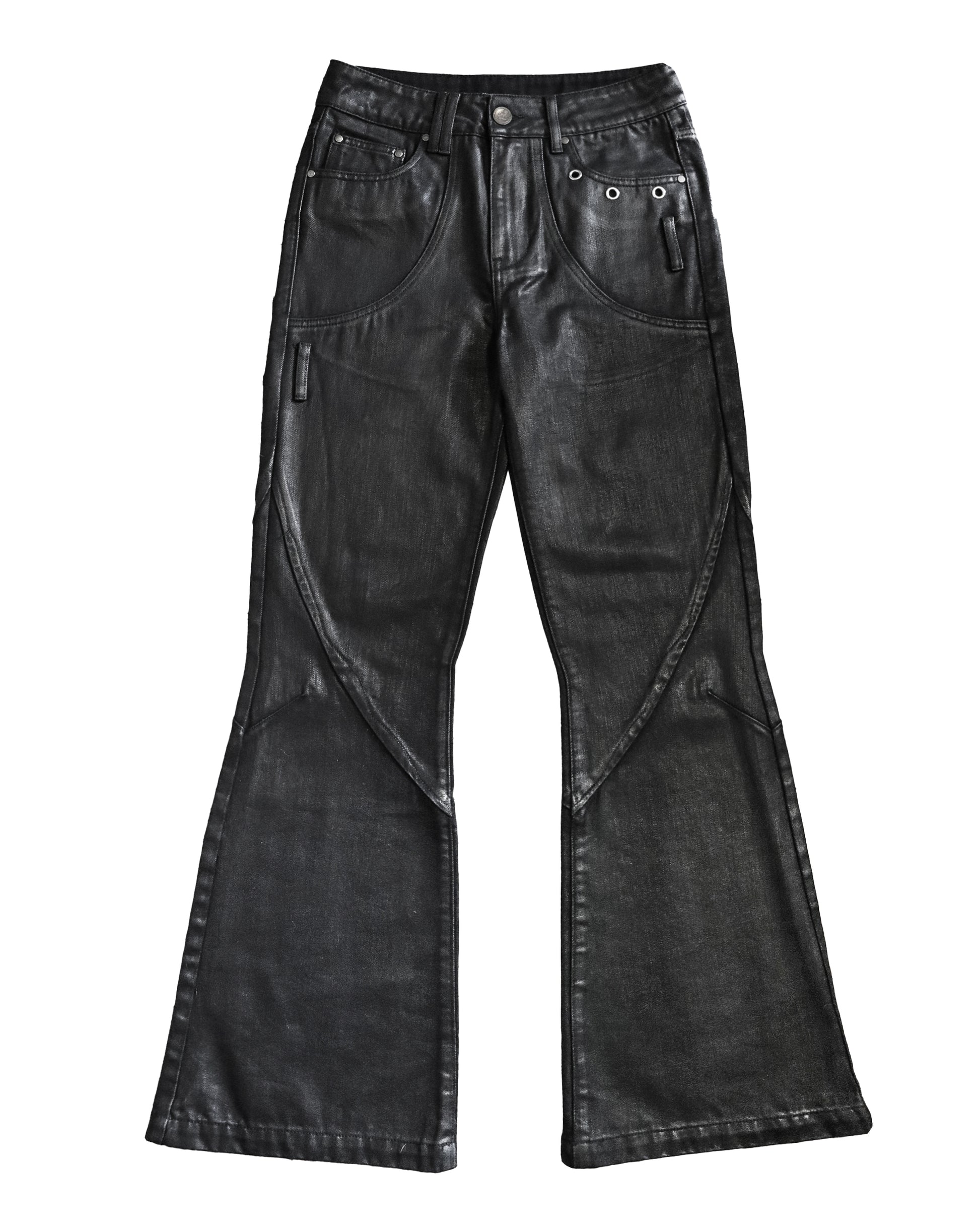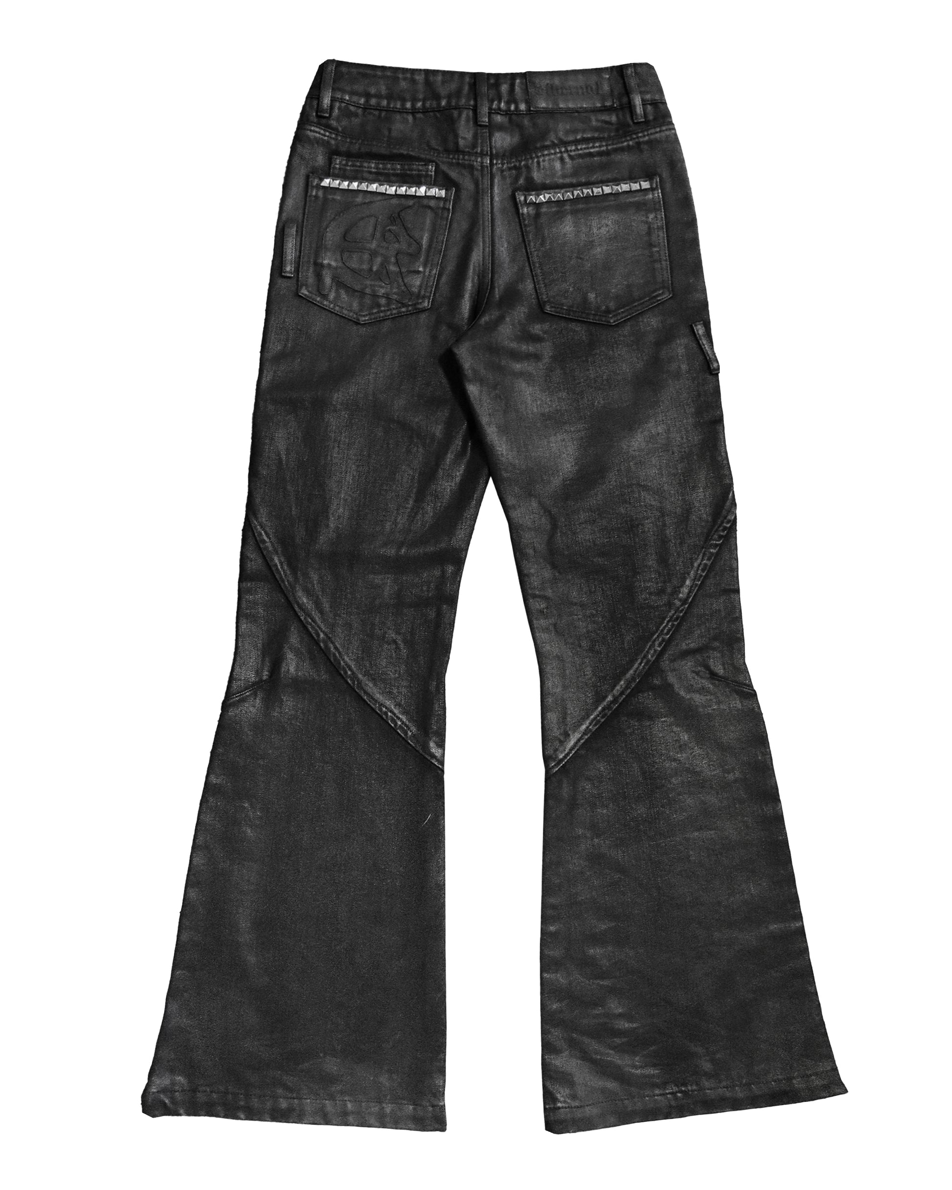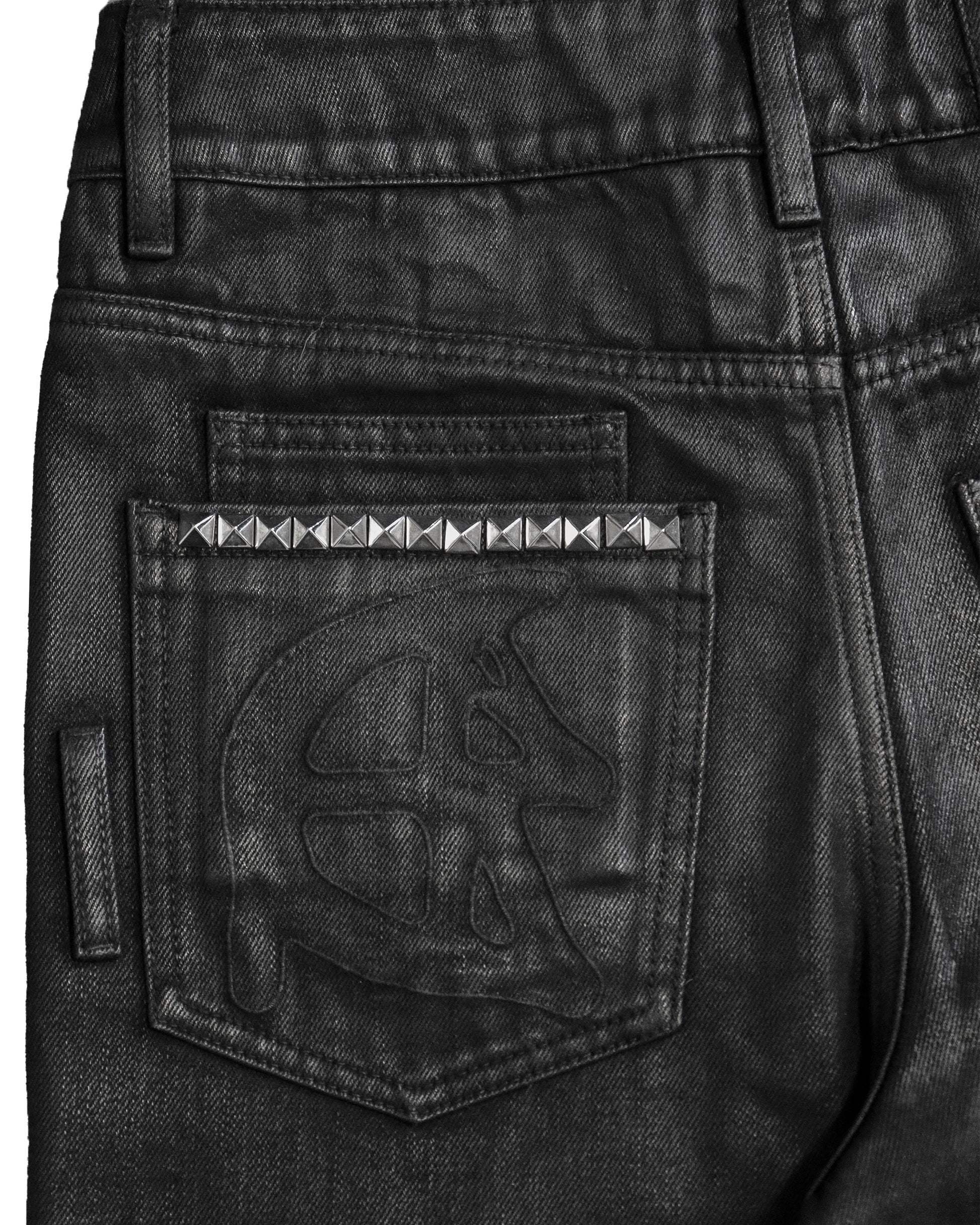Somnium waxed flared denim crafted from heavyweight 14oz 100% cotton denim coated with a wax finish. Featuring custom panels and darts. Custom engraved metal button with logo and YKK zipper closure for durability. Decorative metal eyelets at the front pocket and additional belt loops for versatile styling. Rear pockets detailed with stud accents, tonal embroidered ethernal symbol, and logo embroidery at the waistband.